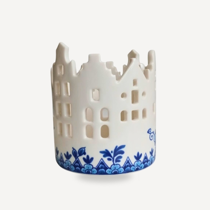 Small architecture, immense feeling. This tealight holder is sculpted as a sequence of canal houses that reveal a different façade from every angle, each one hand-finished in white porcelain with a Delft blue floral base. When lit, the open windows cast patterned light across the table, creating a calm, memorable moment that reads as both decorative object and ritual illumination.