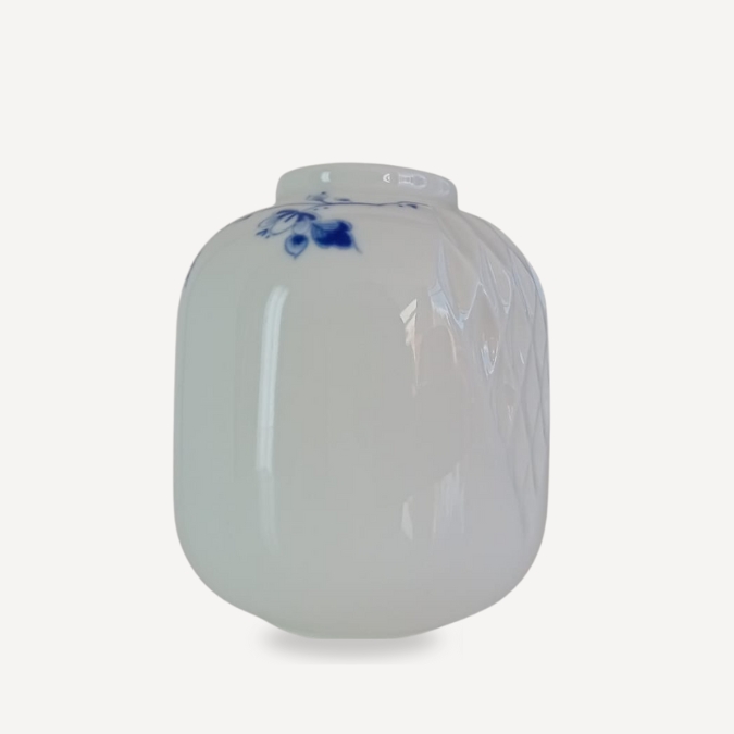 A folding motif captured in porcelain: Romy Kühne translates the precise geometry of origami into Heinen Delft Blue glaze. The Folding Vase No. 3 is a compact sculpture that transforms with light and angle, functioning as a vase, a miniature sculpture, and a storyteller. Each piece conveys the stillness of craftsmanship and the sharpness of contemporary design, making it an instant fit for domestic rituals.
