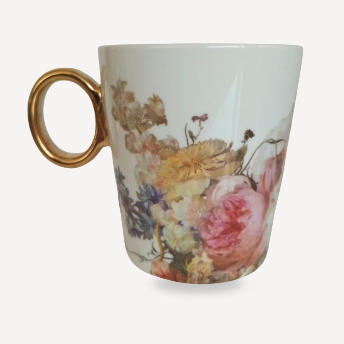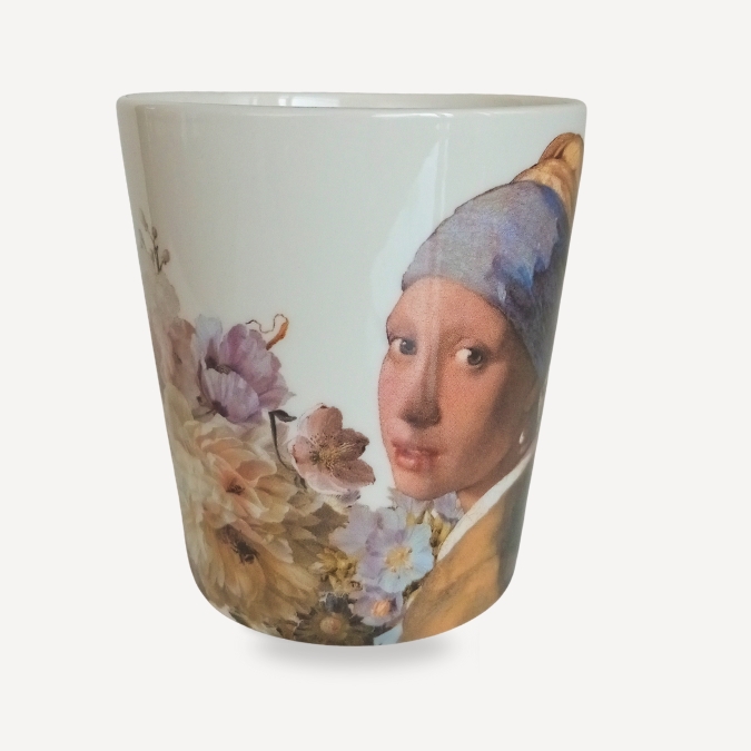 A small masterpiece for the table. The Girl with a Pearl Earring, rendered by Vermeer’s masterful hand, gazes dreamily, framed by a contemporary bouquet in pastel hues. A single gold-coloured pearl echoes the Golden Age of Dutch painting and lends a discreet note of luxury. This mug transforms a simple drink into a ceremonial moment and makes art.
