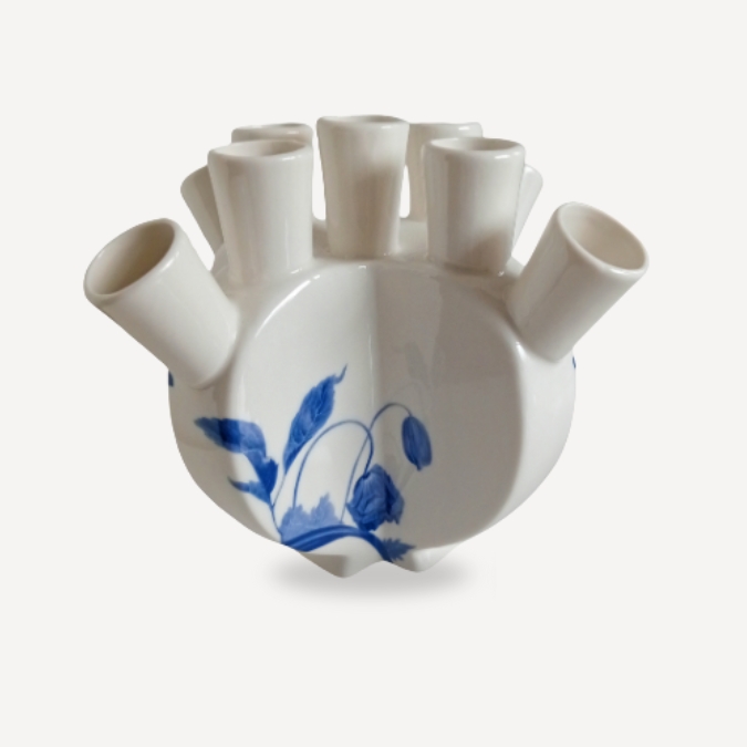 - Decoration: Delft blue tulip motif in a loose watercolour style.